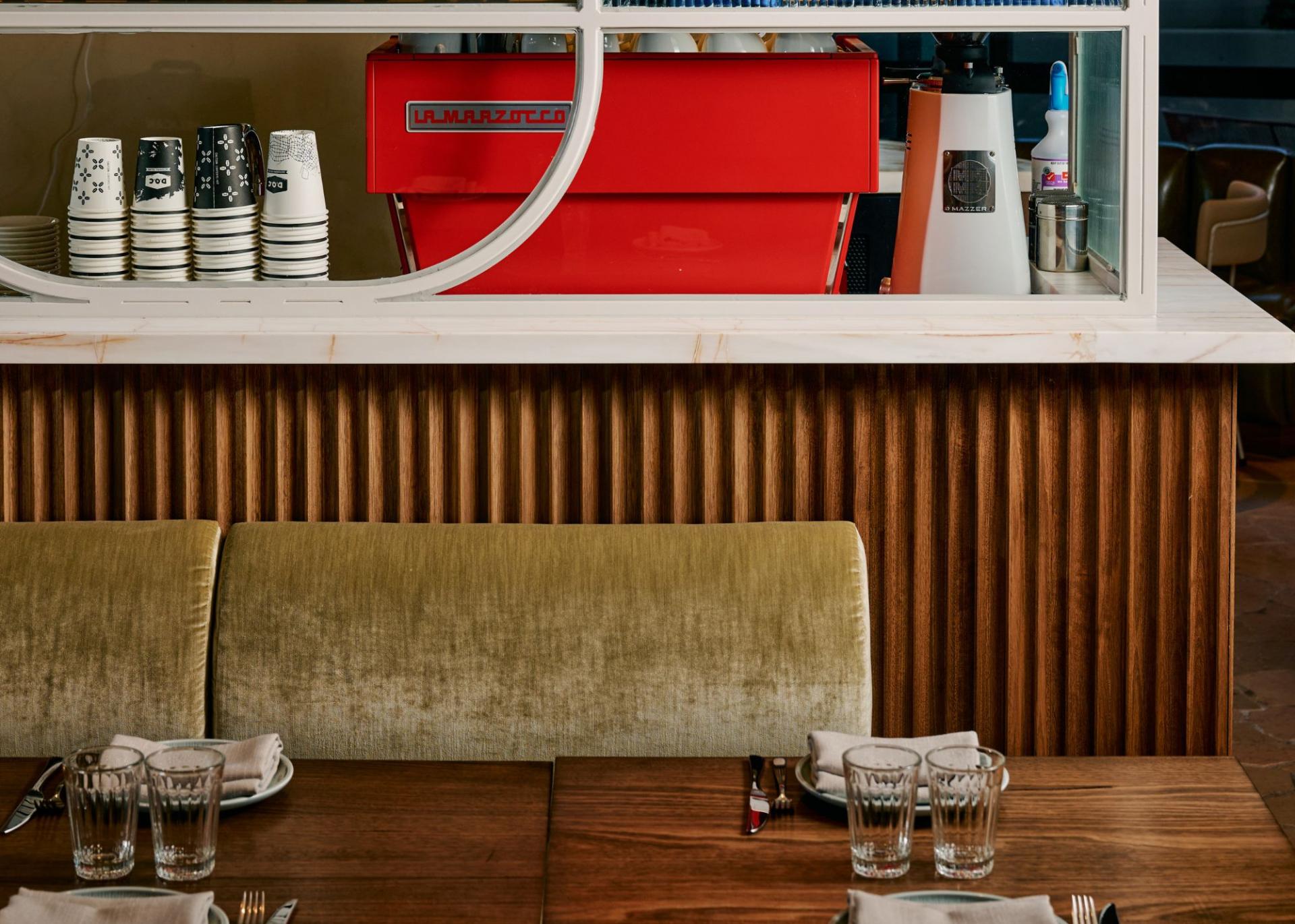 Join D.O.C Pizza & Pasta Bar by the beach to enjoy a modern take on classic Italian hospitality, with a glimpse into dining in Italy’s present day. The palette is calm and neutral. Pops of green and red nod to the Italian flag – with tomato-red detailing on the coffee machine and pizza sign. The kitchen is custom-built with a stone-base pizza oven. Sit at olive banquettes, on the alfresco terrace overlooking the bay or grab a seat at the bar. Let the friendly staff take you on a trip to Italy.