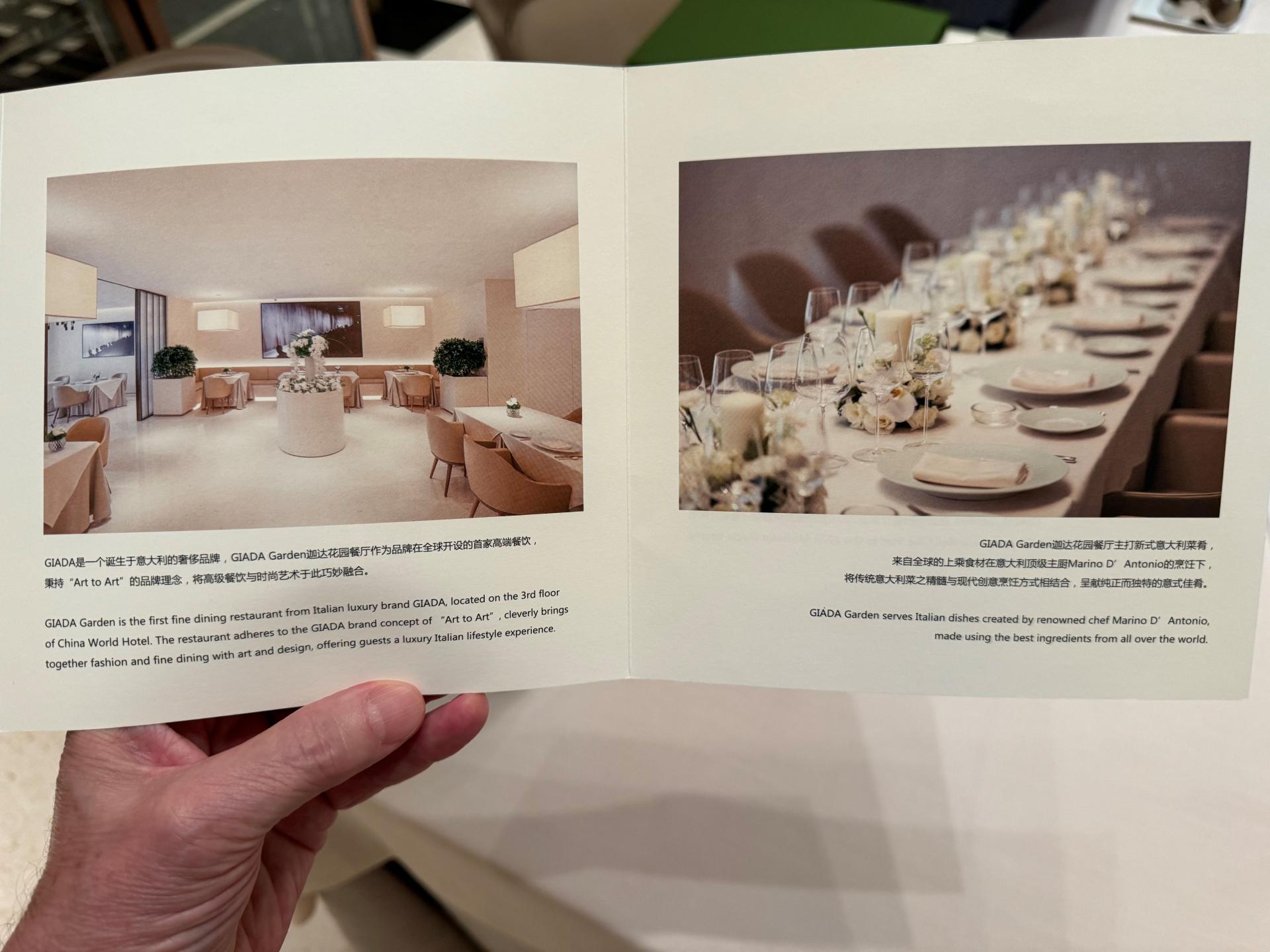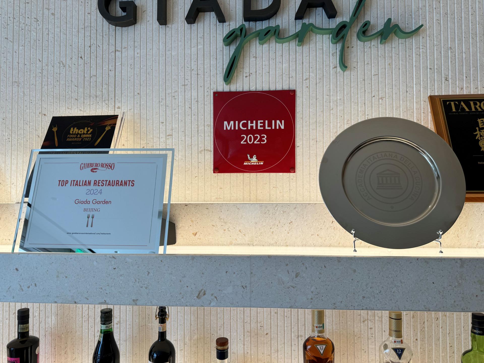 The restaurant is high-end, located in one of the most frequently visited international locations in central Beijing. The environment is very refined and elegant, as a culinary extension of the Giada boutique. The rooms are spacious, with well-spaced tables and furnished with sobriety and great elegance. It is a restaurant awarded a Michelin star for the years 2023 and 2024.