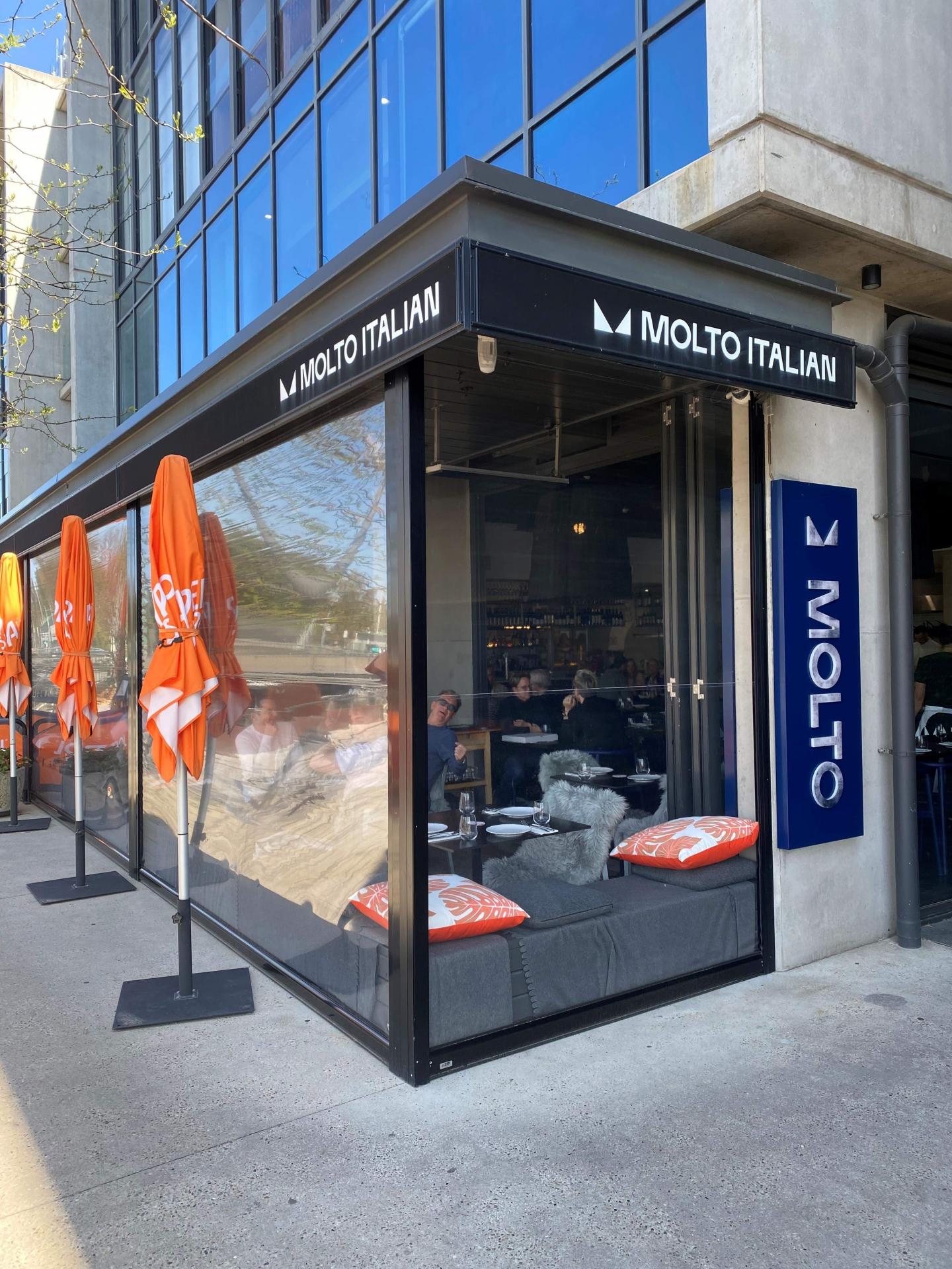 With the aesthetic appeal of a modern seaside trattoria, Molto boasts sleek interiors, high ceilings, an open kitchen and bar and a feature wood fire pizza oven.