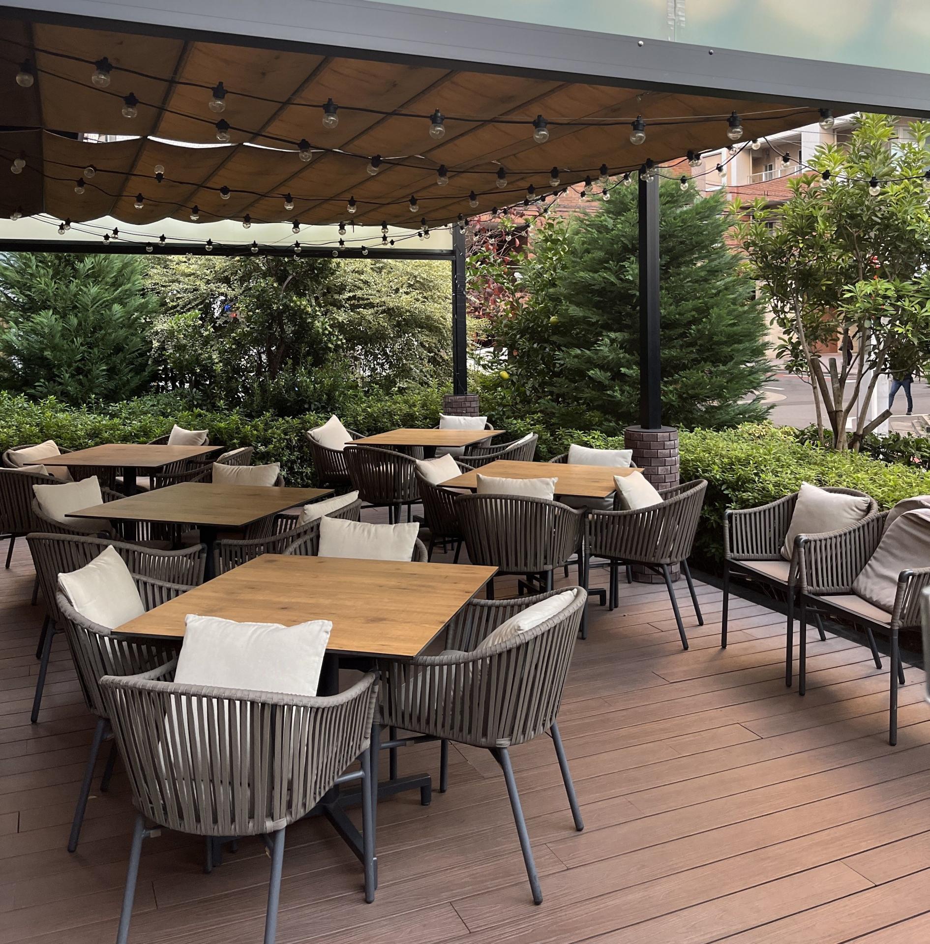 The restaurant offers a spacious and well-lit atmosphere, featuring traditional furnishings designed with elegance and a modern touch. It also boasts a charming little garden, an oasis of tranquility perfect for an elegant meal, whether formal or casual with friends.