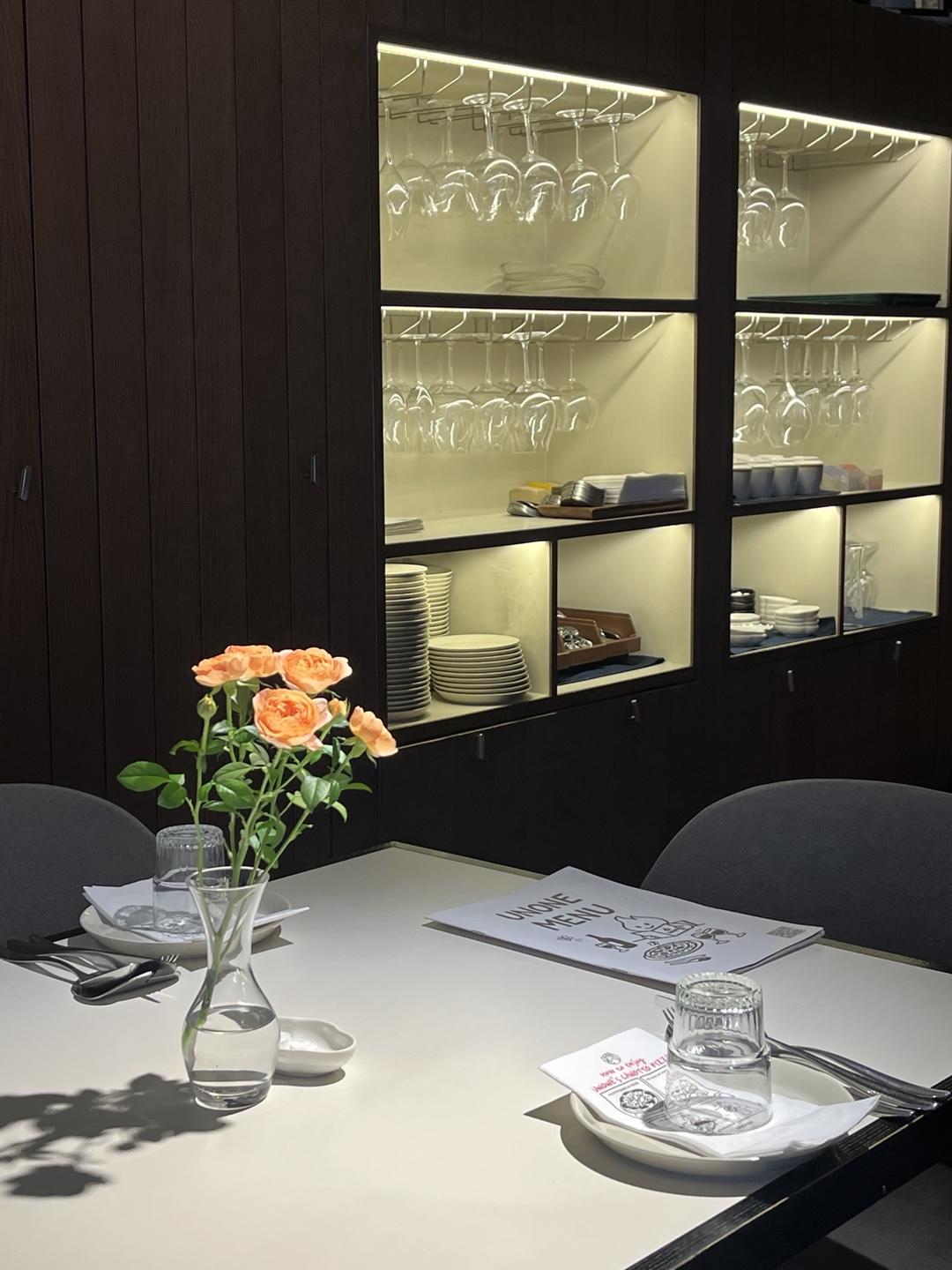 Unone (Un:one) in Mapo-gu, Seoul, offers a refined yet welcoming experience. The interior blends modern minimalism, wooden details, and soft lighting, featuring an open kitchen and a closed outdoor veranda. Perfect for intimate dinners or gatherings with friends, the elegant yet casual atmosphere and attentive service make every meal enjoyable and relaxing.